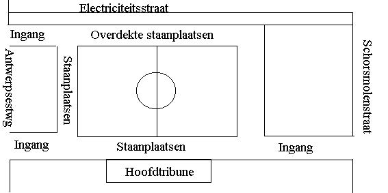 | In de hoofdtribune bevinden zich de kleedkamers, een restaurant met privé-club en een chalet, kortom alle accomodatie. De staanplaatsen, aan de oostzijde (kant Antwerpsesteenweg-Oscar Van Kesbeeckstraat), achter het doel tellen ongeveer twintig treden. |